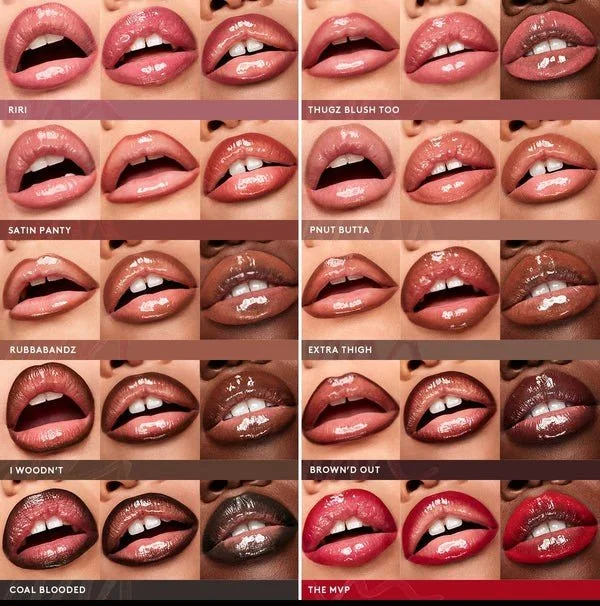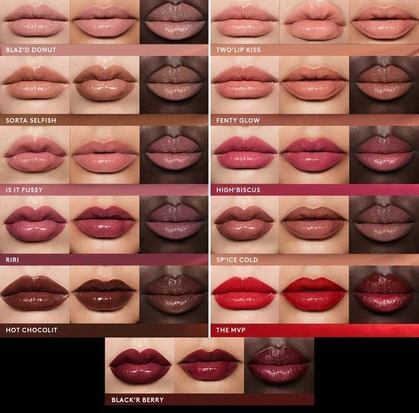 This hybrid of her famous lipstick and glosses come together and promises a high color pay off with the ultimate shine. The key ingredients featured are Squalane, Vitamin E, Shea Butter and Kiwi Oil which help nourish and condition the lips while looking plump and fabulous. Available in 11 shades that range from the everyday natural BLAZ'D DONUT to the bold signature red THE MVP. Check out the pictures below courtesy of the Fenty Beauty Instagram!