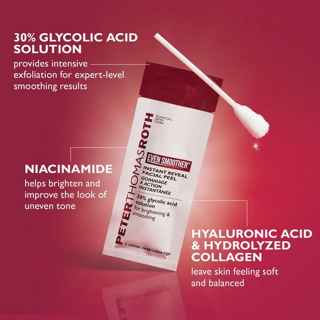 intensive at-home chemical peel. Each individually packaged cotton swab is saturated with a 30% Glycolic Acid Solution for expert-level exfoliation. Skin appears immediately brighter, clearer, smooth and youthful, with more visible results over time. Enhanced with Niacinamide, Hyaluronic Acid and Hydrolyzed Collagen to help leave skin feeling healthy, soft and balanced.
